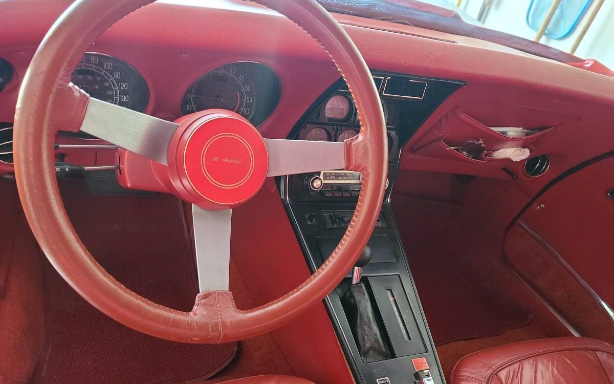 Under the hood, you’ll find a stock Corvette V-8 mated to a stock automatic transmission going to a stock rear end. It’s only got 33,000 miles on it, mostly highway, so you probably won’t be having many mechanical issues with it. Inside, the interior is mostly standard Corvette. The plush leather seats look comfortable, and in good condition. There’s a custom horn button, but that seems to be just about the only modification, with the exception of the carpeted area surrounding the rear window, necessitated by the extended B-pillar.