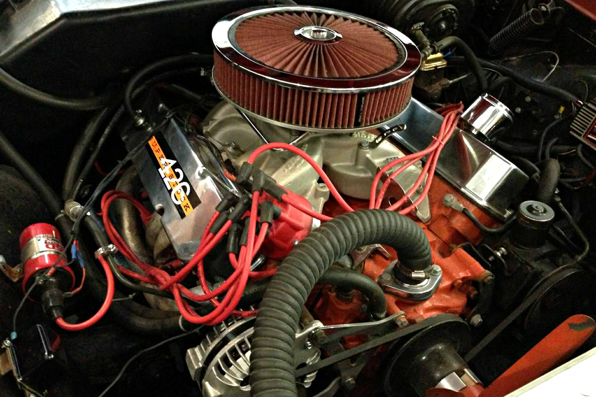 It’s a B series engine with a RB series crankshaft. That increases the stroke and makes it 412 CID. The valve covers are of the Super Stock 426 Max Wedge variety, which would easily bolt onto most all B and RB series engines (they won’t fit the earliest 350B or early 361B).