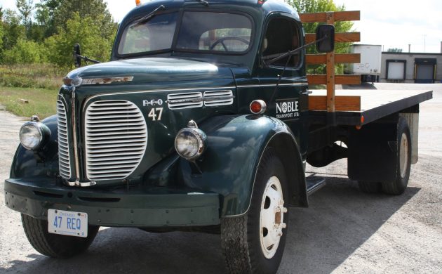 This appealing REO Speedwagon is a great example of post-war Art Deco styling, coming from Ransom Eli Olds’ second act. After selling his Olds Motor Works to GM in 1908, the auto executive founded the REO Motor Car Company. While Olds was responsible for many innovations at the outset of his involvement in vehicle production, he encountered stiff competition after a few years in business as REO. Ford and GM were gobbling up market share with diverse offerings catering to a variety of buyers. Making cars wasn’t profitable enough, so in 1910, REO entered the heavy truck market, and in 1915, it introduced what was arguably the first purpose-built pickup, the Speedwagon. Speedy it wasn’t, but the idea was enough to boost REO’s fortunes, which remained buoyant until the Great Depression. Like a cat with nine lives, REO found ways to persist despite a few bouts of bankruptcy until its final merger with Diamond T eventually sank both companies. From the immediate post-war “streamliner” period, epitomizing forward progress, comes this 1948 1 1/2 ton REO Speedwagon project, advertised for $3800 here on craigslist. The truck can be hauled home from Elizabeth, Colorado. Thanks to Mike F. for the great tip!