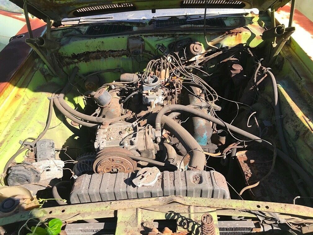 From the photos provided, it’s really hard to find what’s right with this car since more is wrong with it. What isn’t rusted is mostly bent. However, neither the hood nor the trunk lid don’t look twisted. The windshield may be cracked, but the rest of the glass looks good. The rear bumper may be good, but the front one is long gone. We see a bungee cord stretched across the back end which may indicate an attempt to keep the quarter panels from flapping in the breeze. There is virtually nothing that looks salvageable in the interior and the dash pad would have to qualify for the “Worst Dashboard in History” award if there was such a thing.