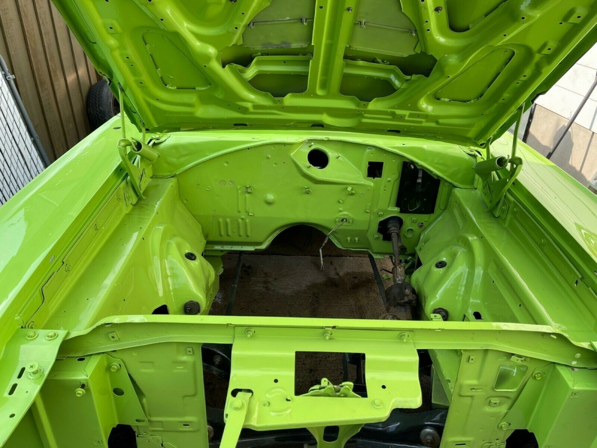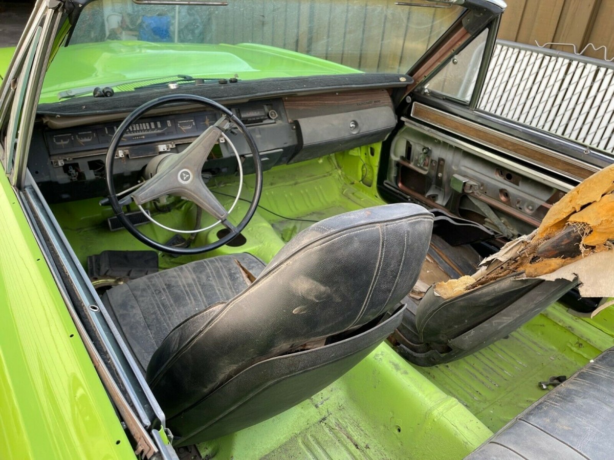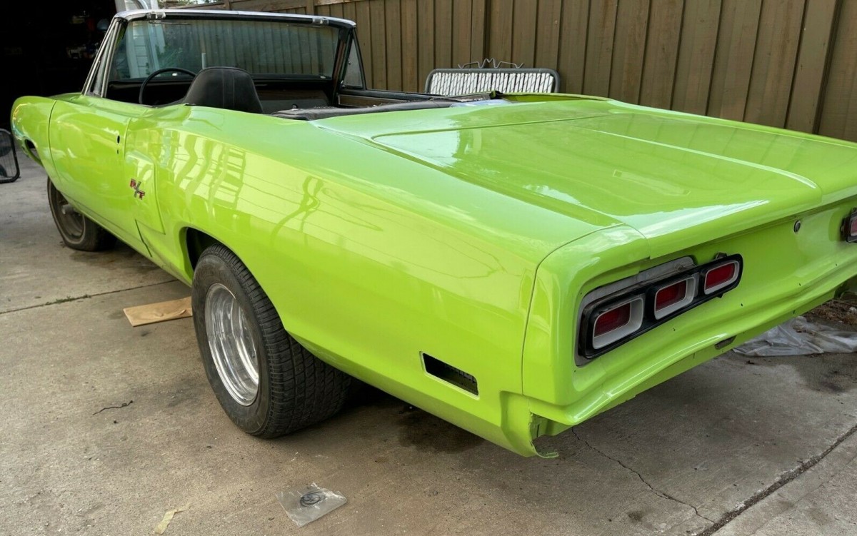 The Chrysler Historical Collection says that out of 110,000 Coronets that were built in 1970, the 500 convertibles saw less than 1,000 made. And R/T convertibles had less demand at under 300 copies. This 500 has had all its bodywork done and painted in one of Dodge’s Hi-Impact colors, Sublime, though we don’t know if this color is original to the car (you can see overspray on the undercarriage). R/T hood scoops have been added to what we’re told started as a rust-free Nevada car. The paint looks good although the seller mentions it has picked up a couple of small garage dings from being rolled around. Front and rear bumpers have both been re-chromed and it seems that most everything is there, though scattered about.