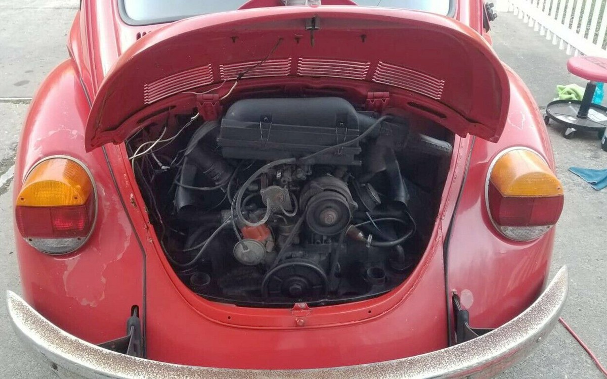 And, here’s the VW Beetle engine in the rear. It should be a 1.6L flat-four with about 50 horsepower. I can’t imagine what kind of engineering and fabricating it would have taken to connect the rear engine with the rear wheels and the front engine with the front wheels. The seller says that this one needs to have a new (included) clutch cable connected. Any thoughts on this one?