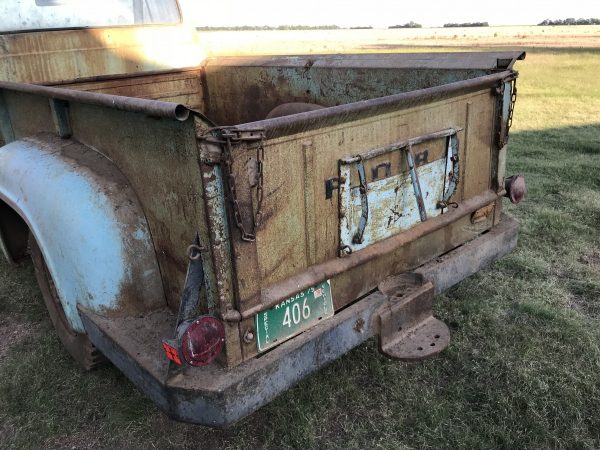 Yup a grain door in the tailgate. Kansas is a great wheat growing state. Growing up in Eastern Oregon, the farmers personal pickup often had such a door cut into the back to pick up small piles of dumped grain or to empty out a wheat combine hopper at day’s end. But that pickup and the actual wheat trucks ( usually WW2 1 1/2 – 2 tonners) did not have hydraulic dumps. Pulling into the elevator, you parked the front wheels on a lift and the truck front was raised thus dumping the load into the grate in the floor. Usually all these vehicles had the exhaust running from the manifold(s) right out the top of the front fenders where the muffler was mounted. A wheat fire is a fearful thing. The fast burning grain creates a long front line and the rising heat draws in air behind it creating a horizontal rolling cyclone that fans itself. Seen a few. :-) Terry J