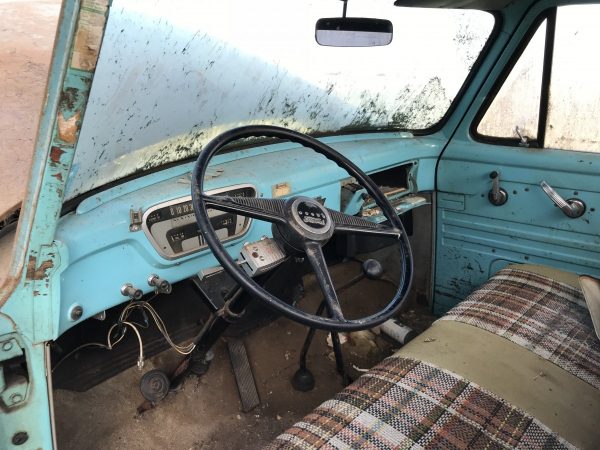 After speaking with Will and the owner, I set up a time to view the truck. I was able to meet with the owner’s brother, who was still living on the farm at that time. He was very kind and was glad to carve time out of his day so I could look things over. We had a great talk, not only about the truck but about years-long spent as well. Surprisingly, for a farm truck, it had very little rust through and the interior was actually in really nice shape for being original. Opening the patinaed exterior to find that interior was a bit of shock. The truck didn’t run and unfortunately, the engine was stuck. Marvel Mystery oil was applied in hopes that it could possibly break free.