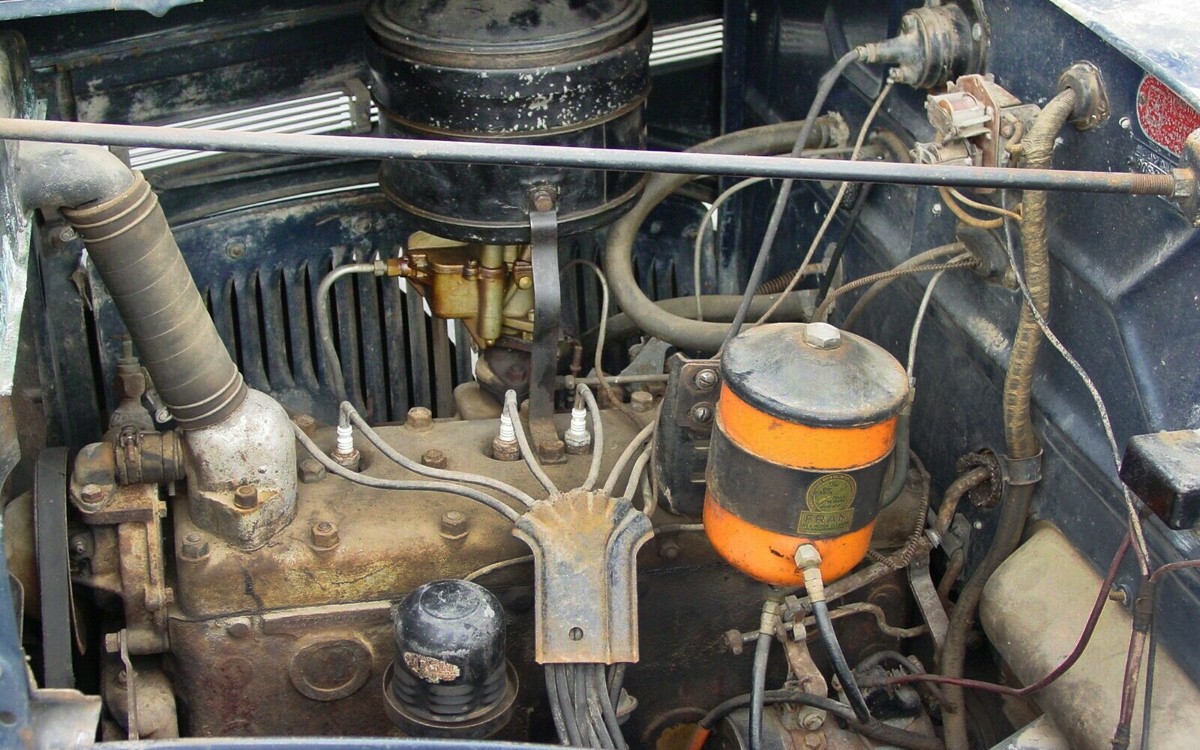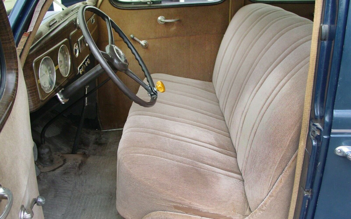 The interior looks great, if this is actually all original as the seller says, it’s amazing. The ’37 Plymouth P4s gained a bit more foot room because of a new hypoid rear axle so the driveshaft hump went down compared to previous cars. The seats look like they’re in excellent condition both front and rear. To say that the wood grain dash is beautiful is an understatement. The 3-speed floor shifter worked through helical-cut gears for a smooth shifting operation.