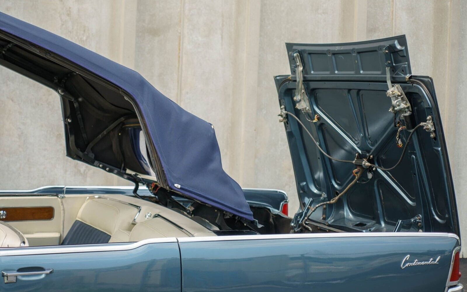 We’re told the color of the car is silver/blue, but I see green more than silver in the mix. The seller also mentions that the power-folding top is new and white but it’s clearly black unless the top was changed after the pics were taken. Note how the top retracts a lot like the Ford Skyliners of 1957-59. One positive upgrade to the auto is that it now has disc brakes in the front for improved stopping power. At 64,000 miles, we assume the 430 cubic inch V8 may have been tinkered with when other updates were made. As was the case with many Ford products in the 1950s and 1960s, the hood hinges at the front.