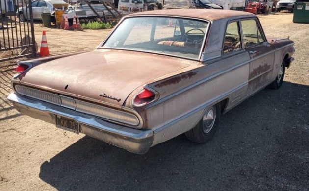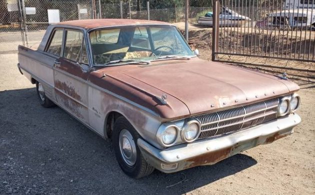 Well, if you name a car brand after a planet, I guess it’s not unusual to find models with names like Comet and Meteor in the lineup. Actually, the Meteor name had made on-and-off appearances at Ford Motor Company in the past, mostly on Canadian Mercury models, but in ’62 was applied to a new Mercury intermediate model; it was the complement to Ford’s new downsized Fairlane. Body styles were two and four-door sedans, spread across standard and Custom trim levels. Total Meteor production was either 68.9K units or 51.7 – I pulled two different volumes from two different sources, and it’s this standard Meteor trim, such as our subject car, that is where the variance occurs. Anyway, today’s find is intact and appears to be complete. The seller adds, “very original car that was left outside to cook in the sun. Surface rust only, no rust holes or rot anywhere.” All of the trim looks like it’s in place, though the bumpers have seen better days. I think it’s remarkable that all four original wheelcovers are still attached.
