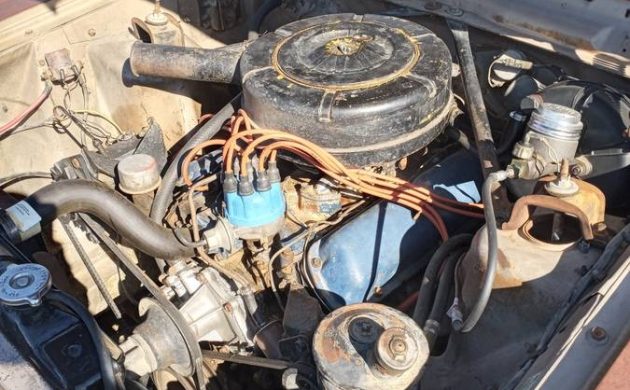 The interior’s condition is about what one would expect. That heavy sunburn has dissolved the dashpad, cracked the steering wheel, and likely destroyed the seating upholstery – it’s tough to tell with certainty as it’s covered over by what looks like a quilt or tablecloth. There’s just the one image, and it’s not too comprehensive, though the very glittery instrument panel still shows well.