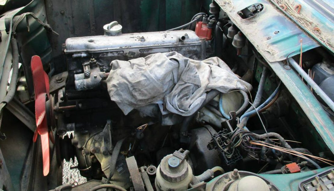 The engine bay, surprisingly, is one of the cleaner parts of this car. There’s still more signs of vegetation on the cowl, but the paint matches under the hood and the mechanical components look more vibrant than I’d expect. Perhaps the previous owner got so far as to rebuild the engine and do some cleaning of parts like the early BMW red fan and the valve cover / oil cap. For $950, you can live with some unknowns and see how cheaply you can bring this ’02 back to life.