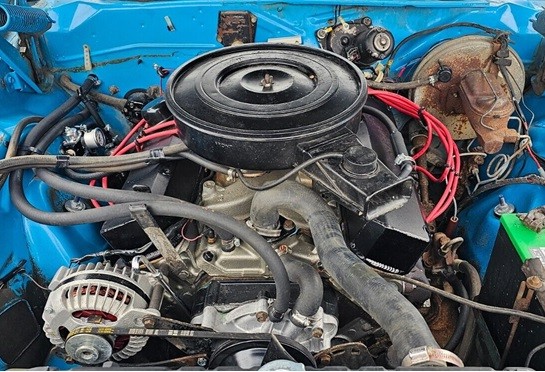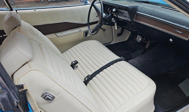 The combo is quite eye-catching and the white upholstery, door panels, and vinyl top match nicely with the vivid blue paint job. The black carpeting is a bit of a surprise – I was expecting navy blue rugs – but it is original to the car, along with the seat materials. The are some cracks in the dash but that’s to be expected in an unrestored example. The seller notes that this Charger resided in the care of one family since new before he acquired it.