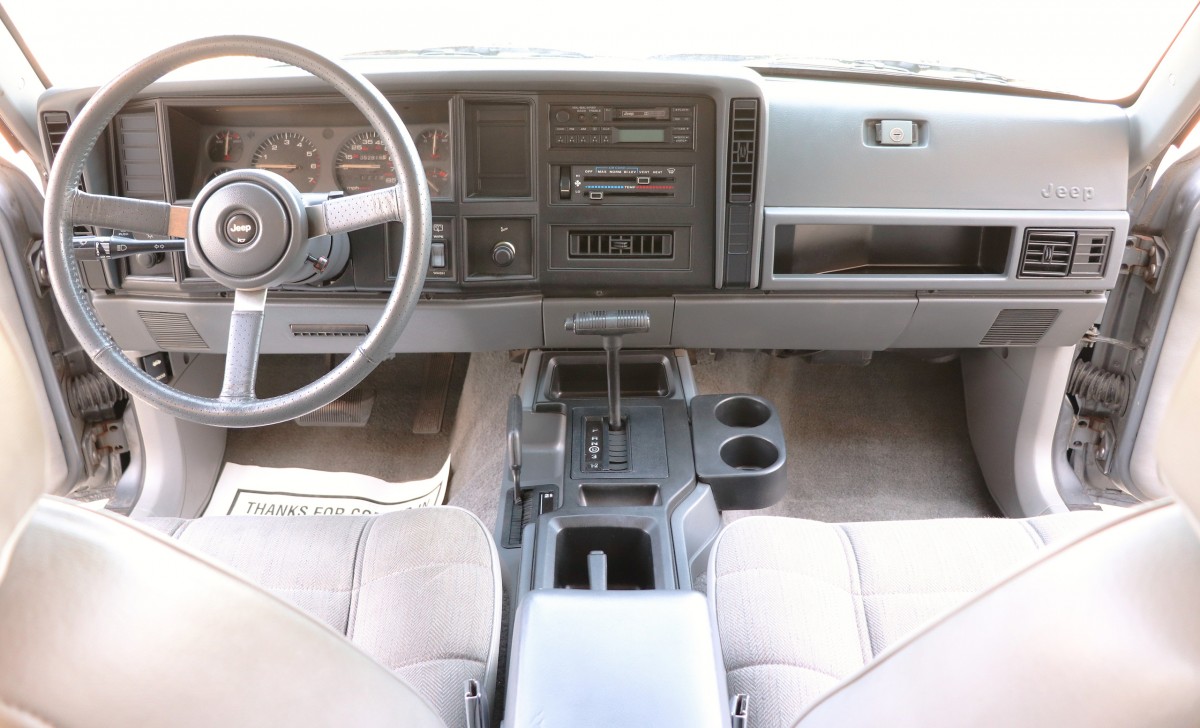 Inside, you’ll find this XJ has a very simple interior, and it’s impressive seeing one in complete and immaculate condition. The SUV still has its original cassette radio, working heat and air conditioning, blemish-free grey cloth seats, and clean carpets.