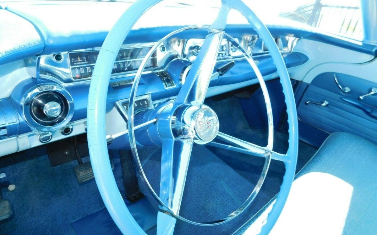 The matching blue interior is also original, showing only minimal wear on the seating surfaces. All things considered, it’s remarkable how well it’s held up over the past 63 years. Carpet and headliner are a bit dirty, but look wear and tear-free. I’ll keep my fingers crossed for the high bidder that they’re cleanable just to help maintain this car’s originality.