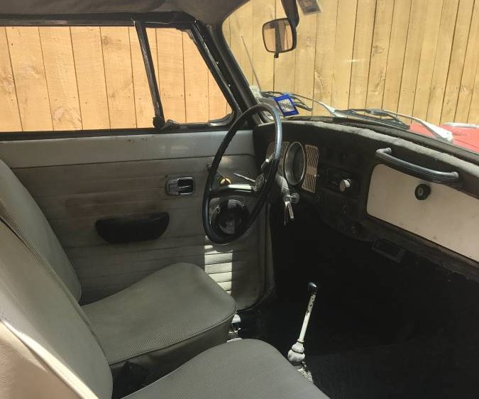 The white and black interior looks like it might clean up okay, although the driver’s seat looks a little short on padding. That’s a traditional four-speed there, by the way, not the poorly received “Automatic StickShift” semi-automatic available on 1968 and ’69 VWs.