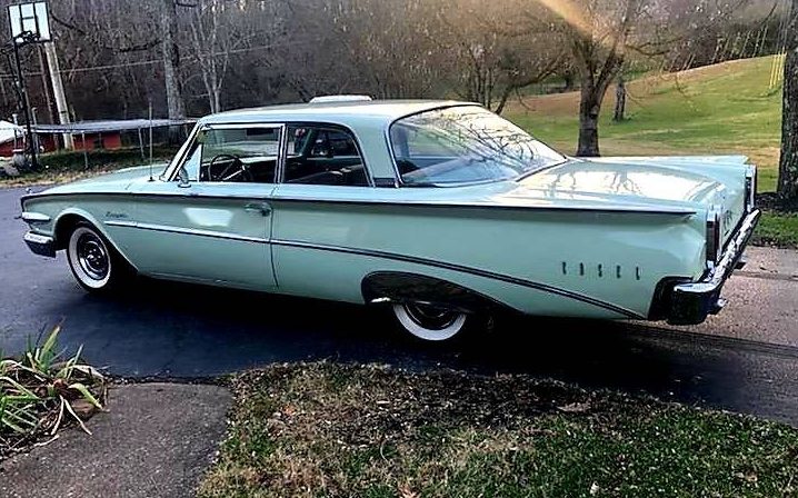 I have loved Edsels since I was a little kid. There was a white 1960 2 door version in my town in the early 70s in the back of a parking lot on the main drag through town. It sat there for many years before finally disappearing. When I was a teenager I saw a mint green and white 2 door ’58 Edsel for $500 towed out of a barn and set by the road. I wanted it but it wasn’t meant to be. In 1975 I saw a red and white ’59 or ’59 in a corral of old cars in Tombstone, Arizona. Very cool. People have made fun of Edsels claiming the grill looks like a toilet seat. Whatever. I am still a fan of them.