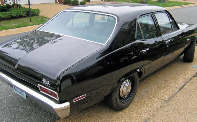 It’s important to note what a solid sedan this one was to begin with, with the seller stating that the car only had 31,000 original miles at the time the transformations began. There’s no word on the original exterior color or what bodywork was performed, if any, but the sheet metal appears straight and free from defects. The black paint is holding up nicely, with the plain wheels and hubcaps adding to the sleeper effect here. About the only indicator outside that this is anything other than an ordinary Nova is the license plate, 4FSTDRS, which might be fun to preserve if that vanity combo happens to be available in your state.