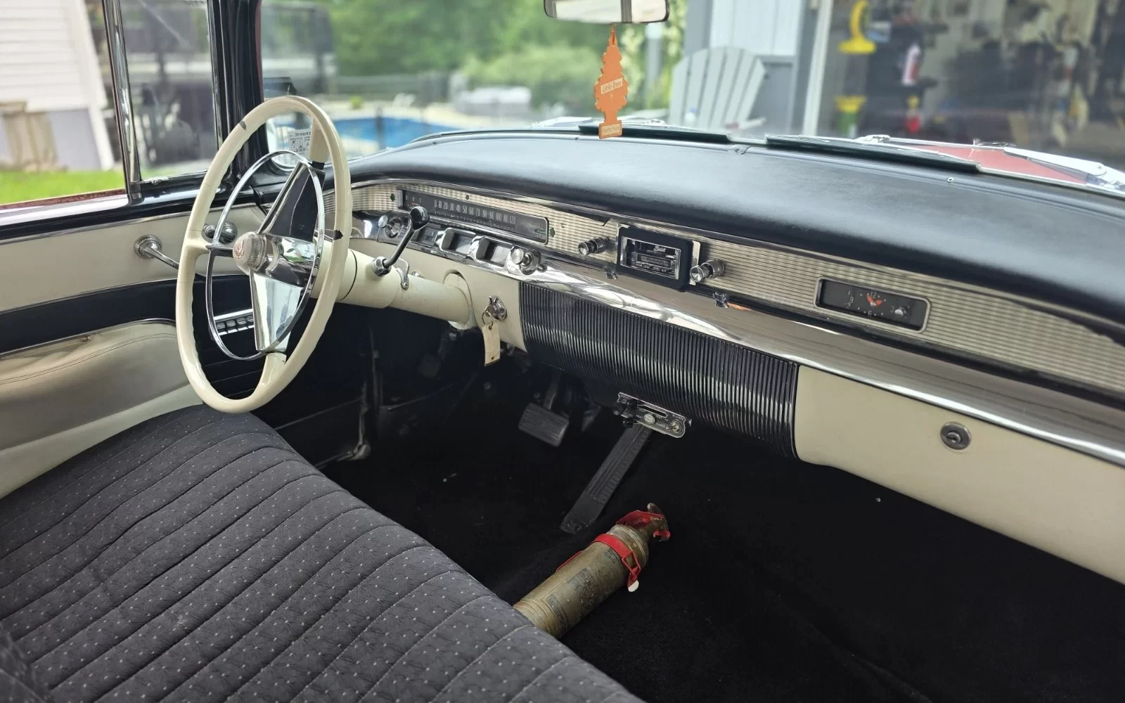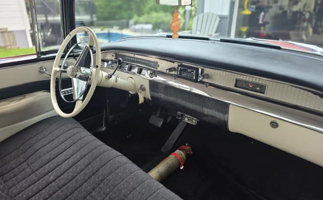 As any Buick fan already knows, the Roadmaster was the top of the Buick line, riding on the big C-body General Motors platform. Buick had watered down the Roadmaster’s porthole count (always four) by inexplicably giving the Super and the Century four portholes per side, but the Roadmaster was still the boss. The four-barrel 322 Nailhead made 255 horsepower in 1956 (in all models but the Special – talk about watering down your flagship), which was enough for a top speed of over 110 miles per hour. Standard equipment was generous: power steering and brakes, Variable Pitch Dynaflow, electric clock, and power windows and seat in convertibles and Rivieras such as our featured car (“Riviera” was Buick’s name for their hardtop models). The seller says that this car has 85,788 miles on the odometer and that the engine is original (but has a replacement carburetor, the original comes with the car). It “runs good.”