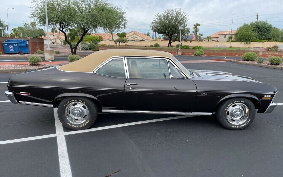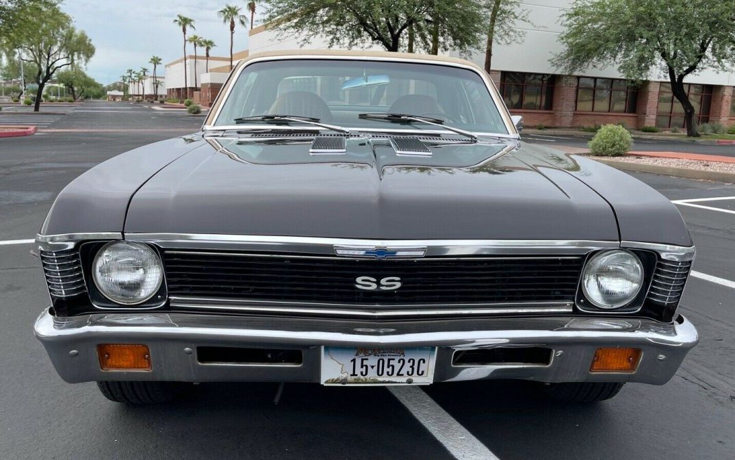 The seller states that the vinyl top was originally white but that’s not what the trim tag states as it displays code “F” which is tan, and that’s exactly what my eyes see. And Midnight Bronze and tan vinyl top may not be a commonly selected color combination for a Nova in SS regalia, but it doesn’t seem all that surprising. On this particular car, it looks great. There aren’t any close-ups provided but there is no sign of paint oxidization, crash damage, or rust – the top’s condition looks fine too. This Nova appears to be equipped with the Exterior Decor Group which includes stainless steel door frame trim and body side moldings. Of note, the rally wheels are the wrong ones for this vintage Nova. These are Corvette style “derby” centered wheels that were discontinued as a Nova option in ’70.