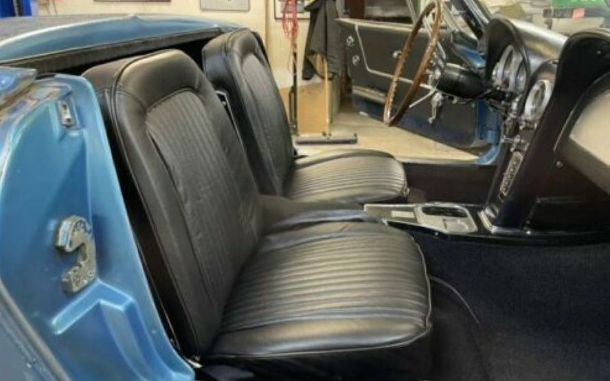 The interior is stock appearing and described as, “New Carpet and seat covers, original door panels and dash, perfect condition“. The seats are referred to as leather and leather upholstery was an option in ’64 though the standard get-up was referenced as “leather grained” vinyl so it’s possible that these current covers could be either (though they look like vinyl). That said, the trim tag states that this Corvette’s interior was originally coded 490BB which is blue vinyl upholstery so the interior has been changed entirely. The instrument panel has a nice clean look about it as it doesn’t appear that any auxiliary gauges have been added. Curiously, there’s no gear shifter evident in either of the interior images.
