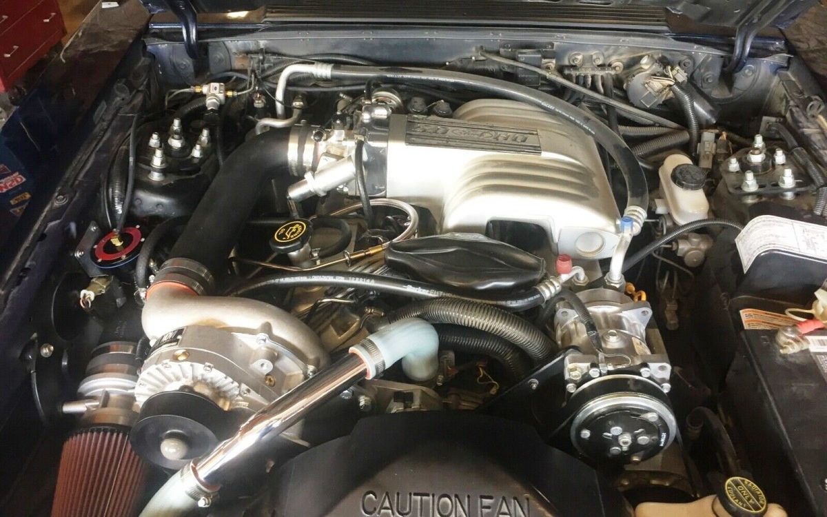 Don’t shoot the messenger; this is the best picture provided of the car’s backside, so the left rear may have a giant dent in it, or someone may have simply bumped the photographer as they snapped this shot. The ALL CAPS listing describes “REAR 1993 COBRA DISC BRAKES,” but I suspect it’s the full ’93 Cobra Mustang rear axle swap I did on my 1989 Mustang LX 5.0. That would account for the half-inch or so wider rear track. Some SSP Mustangs came with these black painted but otherwise standard-issue 10 hole 15 inch aluminum wheels. I painted my Mustang’s wheels like this before upgrading to 17 inch Cobra alloys. Even without the blower, these 5.0 notch Mustangs were one of the fastest cars on the planet when sold, about equal to a Corvette and capable of pulling daylight under one front tire at launch with a few bolt-ons, gears, and sticky tires. Plus, unlike a host of modern cars making 250+ peak HP an instant before they shift, even a stock 5.0 brings massive torque from idle for highly satisfying thrust. We might surmise that the listing makes no mention of the supercharger to attract those seeking a stock SSP Mustang. Whatever the reason, the potent power-adder would be easy to remove, and factory-correct parts could be located and tossed in a bin for the next buyer. Would you suspect this cop-spec blue 5.0 packs a blower under the hood?