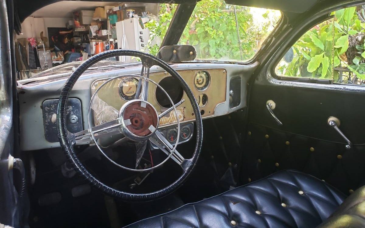 For those worried about a non-original drivetrain, the engine appears to be a continental 226 rather than the original Graham 217. It’s “the same engine” for the most part, but will never take a supercharger as the original did. The intake and exhaust manifolds are correct for a supercharged car, but the block is missing the mounting bosses and oil drain back hole for the blower case. There are other differences as well, but minor. Still, I’d rather see an owner find an original block and restore it to its former glory, there are enough ugly hotrods out there.