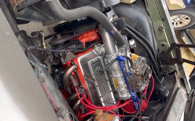 The original engine has been swapped out for a Chevrolet 400, a high-torque small block manufactured between 1970 and 1980. The seller doesn’t go into any details about where this SBC came from, but he does indicate that it runs well, and we can see that it’s received headers plus a set of dress-up valve covers. However, what’s probably most important and definitely the most intriguing feature here is the Weiand supercharger on top. The original automatic transmission is still present, a B.O.P. Turbo 400, which I didn’t think would bolt up to a Chevy engine, so perhaps an adapter or some other sort of mod has been incorporated here.