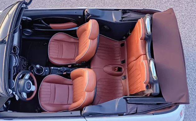 That high-dollar interior looks great. It has been gently used and appears to have experienced limited top-down time, as there’s no indication of any obvious sun damage. Yes, this is a four-seater, but no, an adult won’t fit in the rear seat unless they, and they alone, sit sideways. (My daughter owned a 2006 Mini convertible, so I’ve had real-world back seat Mini experience – ouch!)