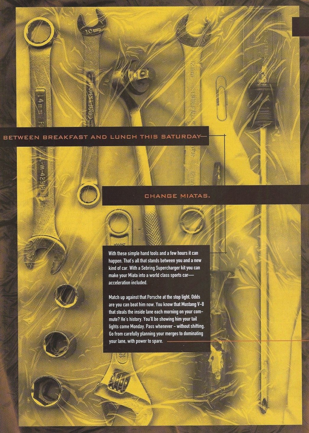 Beating Porsches at the stoplights and showing your tail light to V8 Mustangs? Sounds like some big claims for such a little car. Miatas have always been known for their excellent steering and shifting, but never for their passing ability. This old ad that we found on MazdaRoadster.net claims that the conversion only required basic hand tools and few hours of time. I’ve read that you could pick these kits up at deeply discounted prices when they were new too. How did I miss this?