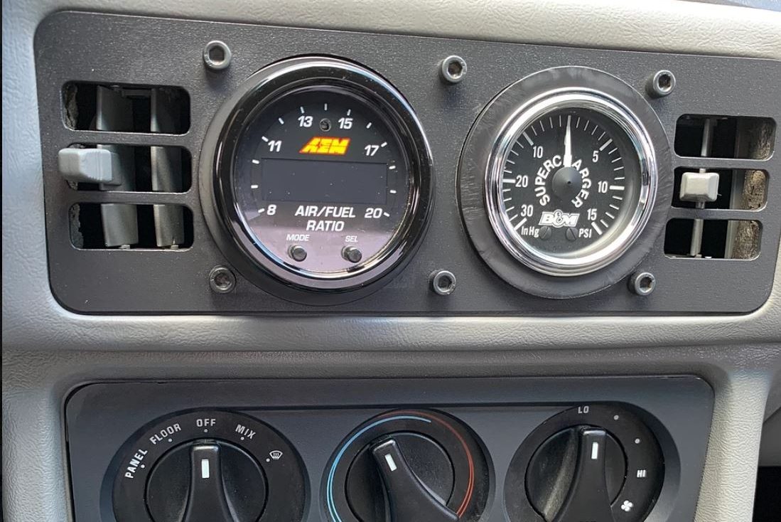 This pair of innocuous gauges mounted above the heater controls give some indication that this classic might be anything but your average Mustang. There are gauges to monitor the air/fuel mixture, along with a boost gauge. Hmm, it seems like someone has chosen to give this vehicle a serious amount of muscle.