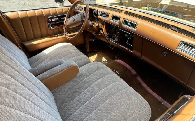 The material chosen for the replacement upholstery is truly unfortunate. It should be caramel-colored leather. Cadillac never used cheap fabric like this.