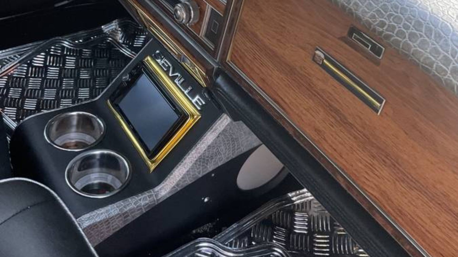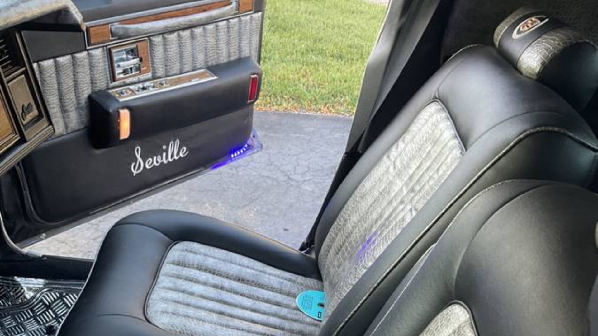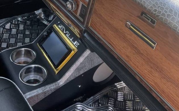 Inside, the custom treatment continues with new interior upholstery and a modern center console featuring a Bluetooth-equipped audio system, backup camera, and custom sound components. The seller claims the system alone cost over $600. Power seats, sunroof, cruise control, and all the typical Cadillac luxuries of the era are present.