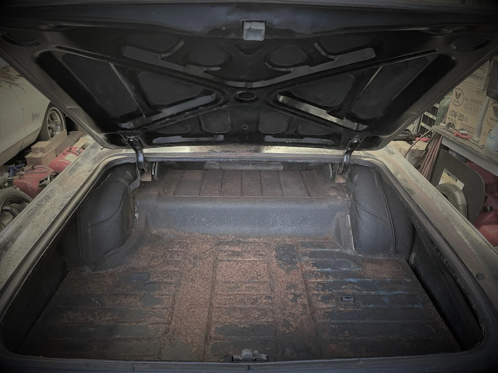 However, some good news is we get to see a lifted shot from down below, which shows what appears to be a decent platform with the seller affirming the car’s solid structural integrity. Even the gas tank seems OK, but this is one of those rides that’s begging for a dual exhaust system just from the perspective of coolness. We also get a photo from inside the trunk which also has some additional rust, but I’m not spotting any actual holes so hopefully it’s all on the top and none has actually eaten through the pan.