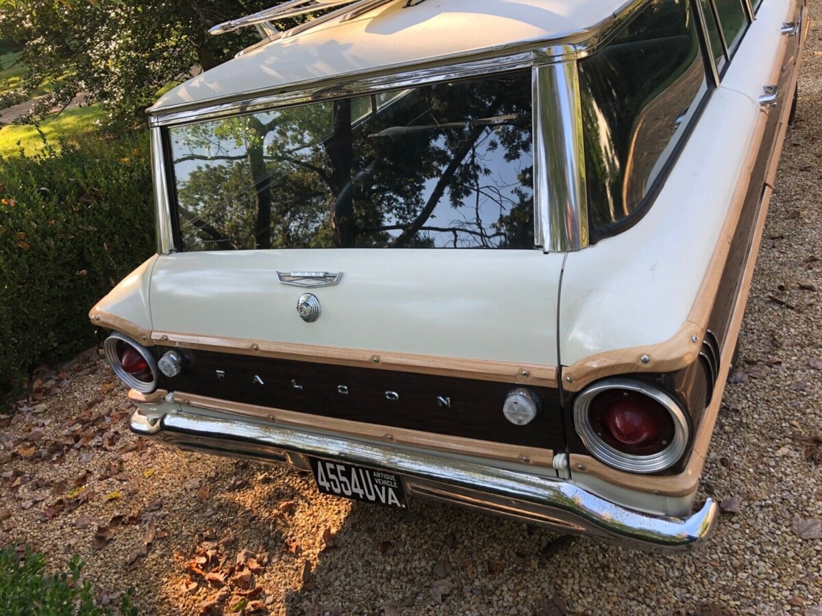 The car was found in a Texas barn and it’s apparently rust-free. Cosmetic work includes new Satin White paint and brand-new faux wood trim. The chrome and stainless trim are not all perfect; the front bumper is wavy and the grille has some damage near the lip of the hood. These round body Falcons are especially appealing with their vestigial fins and simple circular tail lights.