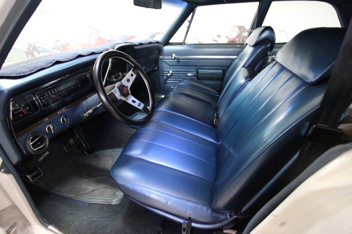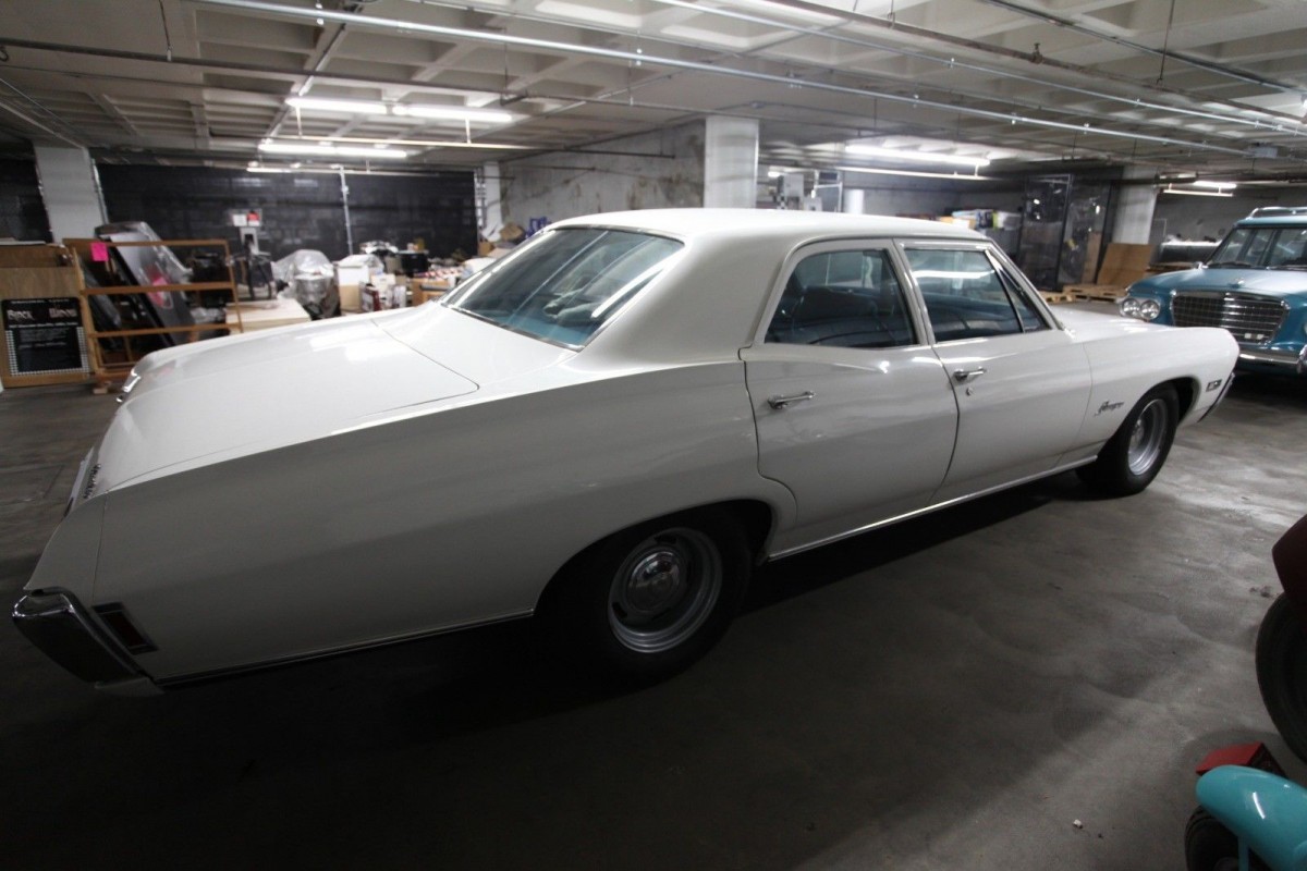 I’m guessing this is a former police pursuit vehicle. In 1968, the Washington State Patrol used 1968 Chevrolet Biscayne 4 door sedans, with a 390 HP 427/TH-400 transmission/12 bolt rear end. All their cars were white with a blue vinyl interior. They also had the rally style wheels with a poverty center cap.