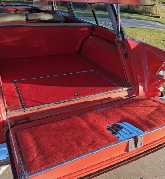 This car was optioned to the gills, with power seats and power windows, a dash clock, pushbutton AM radio, chrome wire hubcaps, and bumper guards. The two-tone interior coordinates with the exterior, right down to the steering wheel. Along with the rest of the cabin, the cargo area and the headliner are, if not pristine, at least very nice.