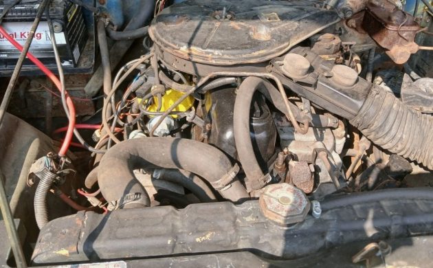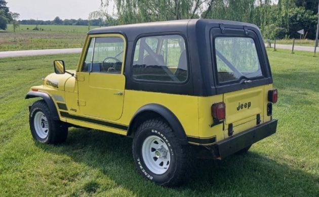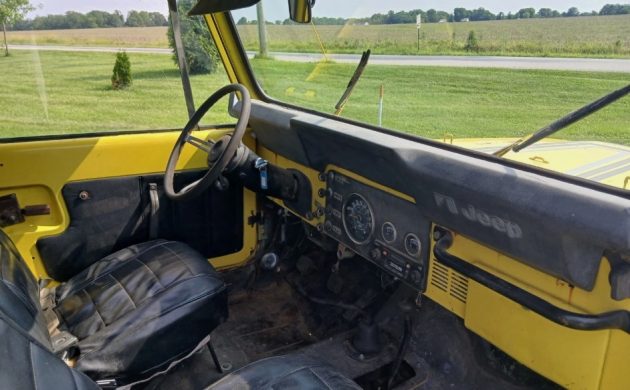 The CJ series was offered with several engine options blended with multiple trim levels and special editions. The seller of this Jeep says that though it wears Renegade decals, it’s probably not a Renegade but he isn’t certain. The Renegade would have been equipped with skid plates and heavy duty shocks in addition to alloy wheels and an upgraded interior. A 110 hp 258 cu. in. in-line six cylinder paired with a four-speed manual moves this CJ down the road. The clutch, pressure plate and throw-out bearing are new, as is the battery. The Jeep runs, shifts, and drives well. That said, this engine bay looks neglected; I’d replace the hoses and that radiator cap at a minimum.