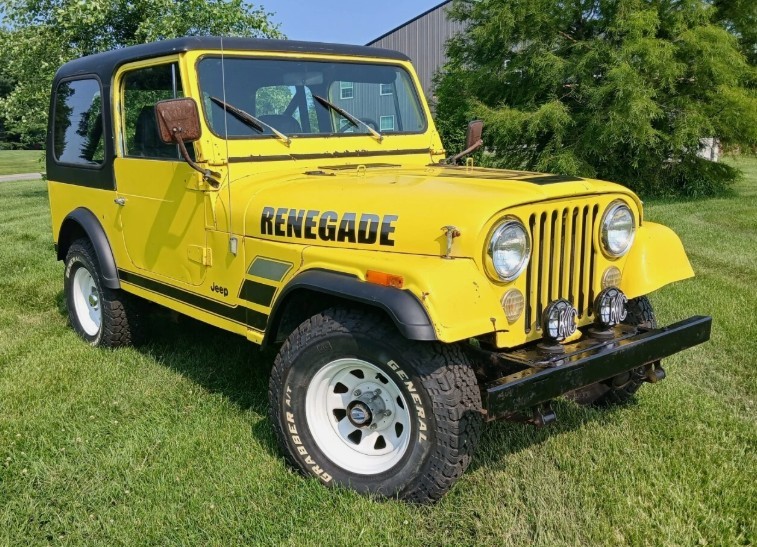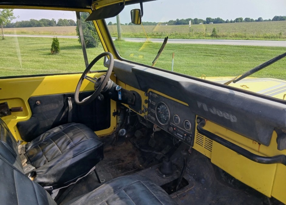 The CJ series was offered with several engine options blended with multiple trim levels and special editions. The seller of this Jeep says that though it wears Renegade decals, it’s probably not a Renegade but he isn’t certain. The Renegade would have been equipped with skid plates and heavy duty shocks in addition to alloy wheels and an upgraded interior. A 110 hp 258 cu. in. in-line six cylinder paired with a four-speed manual moves this CJ down the road. The clutch, pressure plate and throw-out bearing are new, as is the battery. The Jeep runs, shifts, and drives well. That said, this engine bay looks neglected; I’d replace the hoses and that radiator cap at a minimum.
