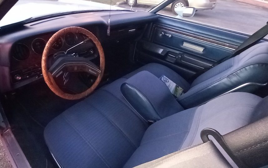 While bucket seats were an option for the XR-7, the original owner of this Cougar specified a blue, cloth, split-bench seat environment. From what can be seen, the upholstery, dash pad, and carpet appear to be clean and belies this car’s mileage. The interior shadows prohibit getting a good look at the instrument panel but there’s no reason to suspect any issues.