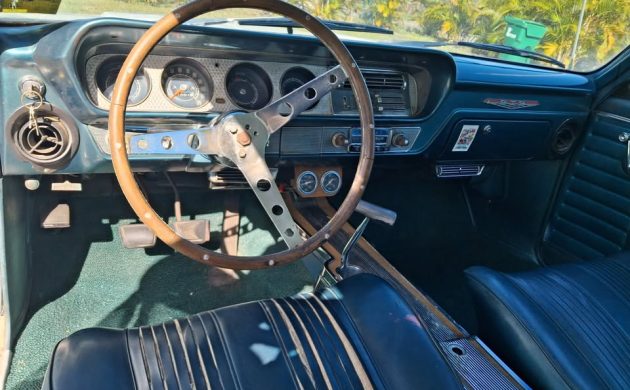 The interior is fair, but not without its problems. The blue Morrokide vinyl upholstery covering the front bucket seats is giving it up, the door panels have gotten dowdy, and the console appears to be missing some of its trim. Originality-wise, the steering wheel has been swapped (and is missing its horn button), the Hurst shifter is wearing a T-handle, and auxiliary gauges have been added to the bottom of the dash – all minor deviations from delivery day. A real surprise was to see A/C in place – often not the case in muscle cars from this era. I wonder if it works?