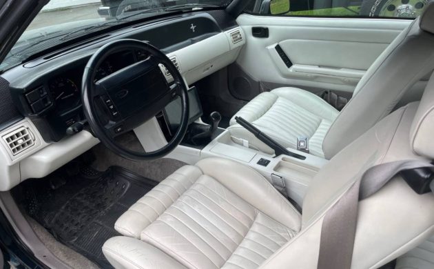 The 5.0-liter V8 paired with a 5-speed manual transmission makes this one of the more desirable drivetrain combinations offered in the Fox-body era. The seller emphasizes that very few low-mileage, low-ownership cars like this remain, particularly in 5-speed form.