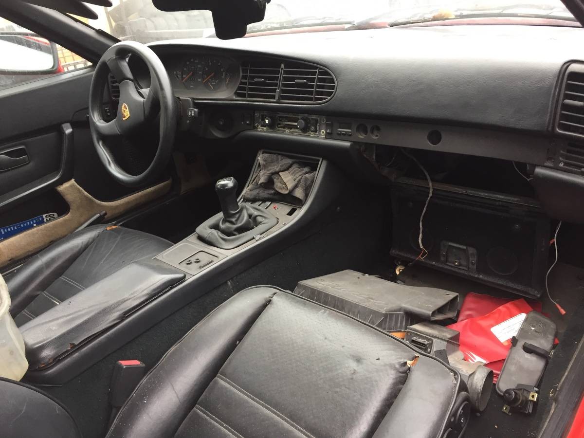 The interior features an aftermarket three-spoke steering wheel, missing radio, and some incomplete work under the dash in the area of the glovebox, usually a prime spot for removing the computer and sussing out ECU-related issues. The seller doesn’t provide much detail on what’s been started restoration-wise, just that it comes with a host of extra parts from another 944 they had access to.