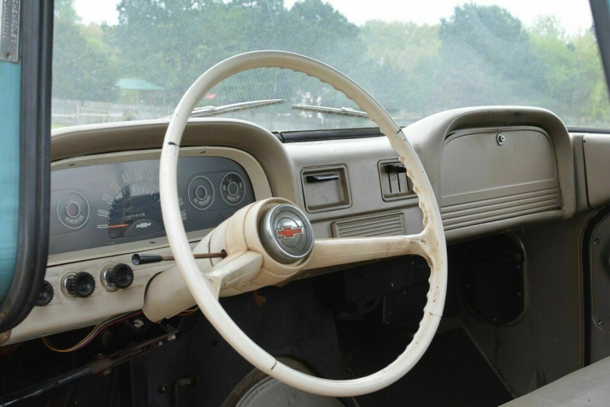 While the ad does not note the engine size, the truck is probably equipped with the base 230 cubic inch inline 6 cylinder engine which delivered 140 horsepower. The optional 292 cubic inch inline 6 cylinder engine produced 165 horsepower in 1963. The optional factory 283 cubic inch V8 engine provided 175 horsepower but not as much torque at the 292 cubic inch I-6. This truck looks original and unmolested. It even has the original spiral shocks and the “three on the tree” shifter has not been moved to the floor.