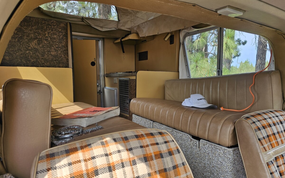 Taking a look inside the camper area reveals not only a fun place to sleep or relax but it’s all very well-preserved, with the original vinyl still on the rear seats and the components we get to view such as the sink and stove also appearing to be in good shape, and even the counters and cabinets seem to have survived well. But be forewarned that the seller has not tested any of the appliances back there to make sure they are still functioning.