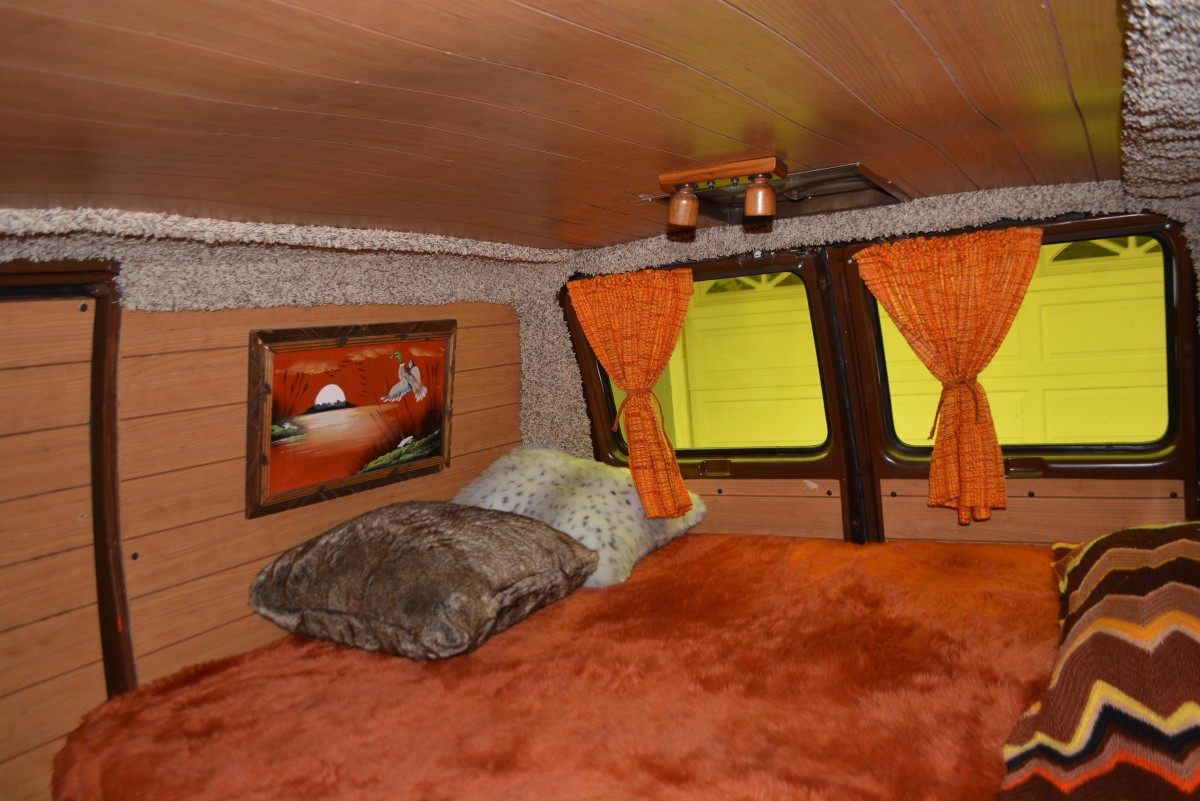 Check out the inside: maximum 70s, right down the painted mural on the wood paneling. The bed area looks fairly recent and clean enough to sleep in right now. The wood paneling continues across the roof sections and looks like a clean install. Curtains provide additional privacy when the yellow tint isn’t sufficient, and a “Hippie Bead” partition/curtain creates the illusion of stepping into a second roof when departing the front captain’s chairs for the lounge areas.