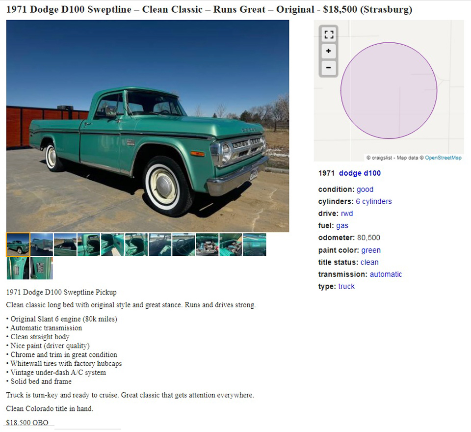 Happy Easter to all who celebrate! This gorgeous Easter Egg-colored 1971 Dodge D100 pickup looks like it just jumped right out of the pages of a brochure; what a beauty. The white walls are a hair too big for me, but white wall tires are shown on pickups in a brochure, just not quite this big of a white wall. The seller has this truck posted here on craigslist in Strasburg, Colorado, and they’re asking $18,500 or offer. Here is the original listing, and thanks to Mike F. for the tip!