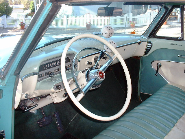 The interior is as drop-dead gorgeous as the exterior is on this car. Other than pink, I don’t know of another color that better captures the 1950s more than aqua does. The seats look great, front and rear, as does just about everything else inside the car. The headliner behind the factory plexiglass sunshield looks like new, too. And, yes, you noticed that 1950s staple: fuzzy dice. I have never understood where, when, or why that got started, but they’re here. This car has the famous Merc-O-Matic automatic transmission, too.