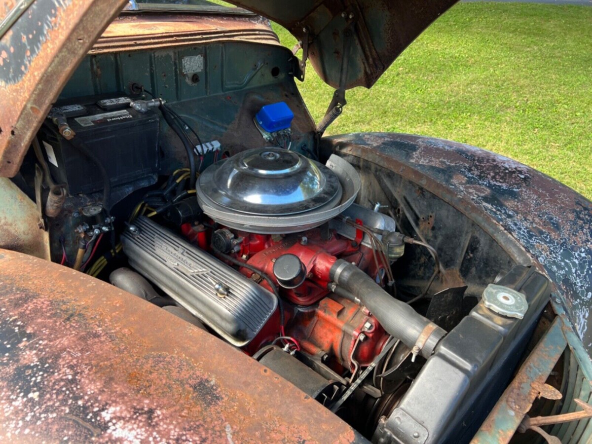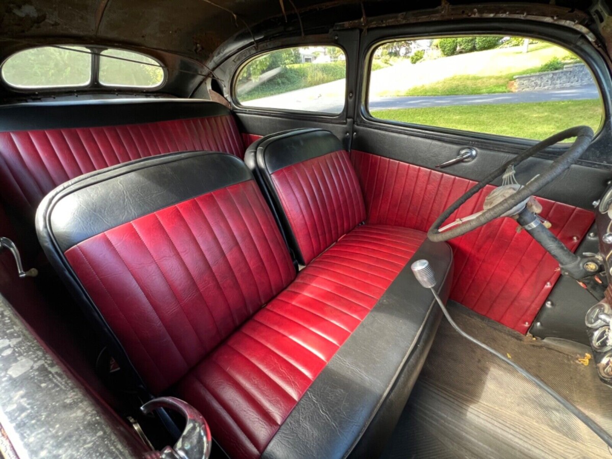 The interior features very nice red and black renewed upholstery, including door panels. The dash is unfinished, though, sharing the body’s patina. That floor shifter leads to a standard 1939 Ford transmission and drivetrain, but under the hood is something else—a 1955 Thunderbird 292-cubic-inch Y block V-8 with new carburetion. “The engine has great oil pressure and runs extremely cool,” the owner reports. It’s not the crusty ‘Bird engine that was in the car when found, but a fully rebuilt unit that the current owner found for it—just $500! It had been in a stock T-Bird that was “upgraded” to some form of restomod status.