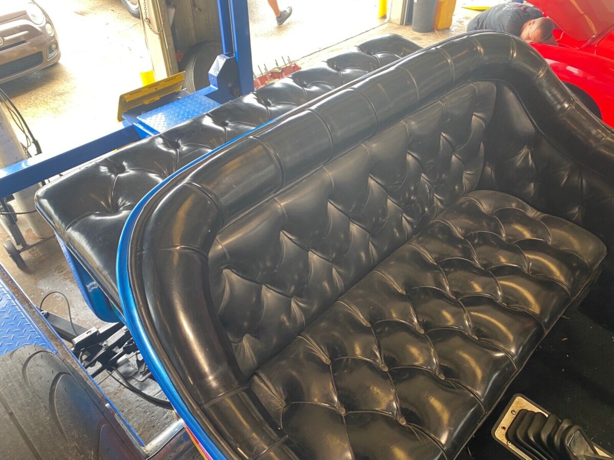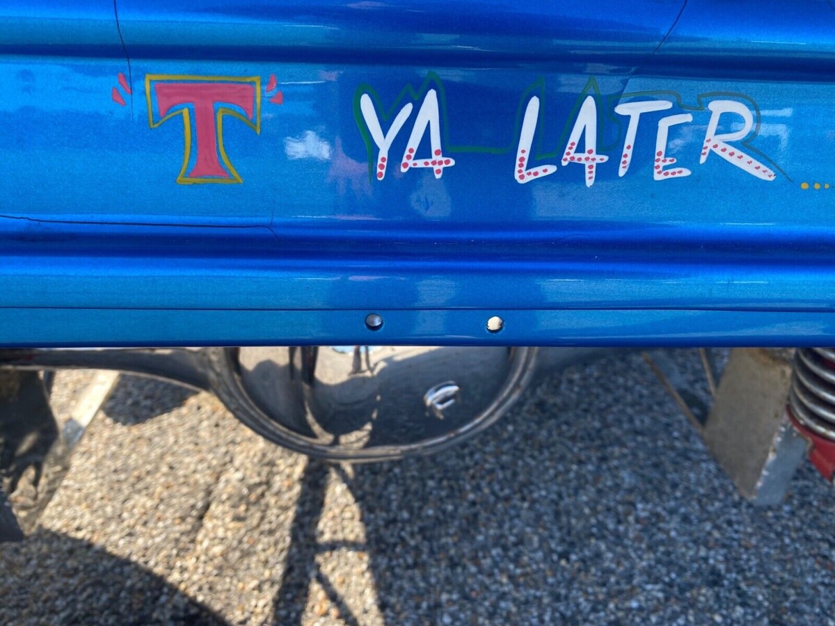 Looking closely at the 1923 Model T seen in the eBay advertisement, there is not much left of an original Model T aside from the general shape. The upholstery pattern, steering wheel, and windshield frame all scream Model T. However, by all appearances, the body is fiberglass. The seller states that there are a few cracks and checking (I don’t know that term), but it still looks beautiful. Given that the paint was done in the early eighties and was likely a lacquer job, you have to admit it is retro-cool and still holds up well. The graphics are a bit loud. However, it was an eighties build after all.