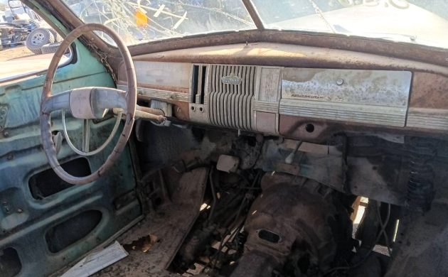 In 1941, DeSoto produced 6,482 Business Coupes, split between two-thirds Deluxe and one-third Custom. Since so much of the seller’s car has already been picked or is broken, we don’t know which applies here (and does it matter now?). We’re told it’s a one-owner car that somehow found its way to the junkyard after 85 years. The body is rough and incomplete, and the bench seat is long gone. Whether there’s any life left in the 6-banger is unknown.