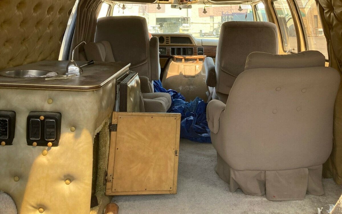 Mechanicals aside, the real party begins inside. You’ve got what looks to be a full-size bed, running water, and quilted leather everything. Well, not everything. What isn’t quilted leather has a dense coat of shag rug on it. It looks like it could be open to accepting a modern redo of the interior, but then you’d lose out on the groovy aspect of the quilted leather and shag. At the very least, you could get some good use out of a new media center. If you can track one down, I recommend an 8-track deck.