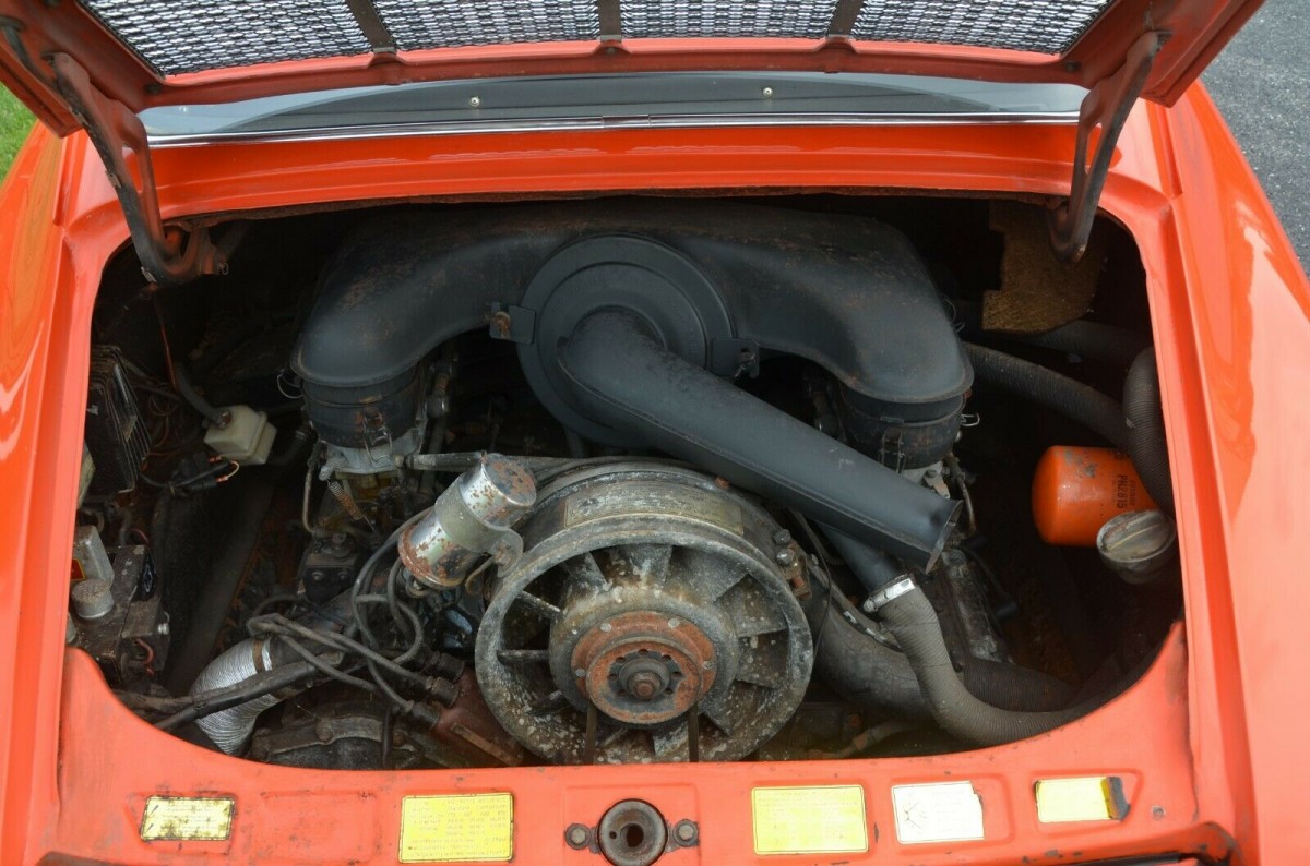 Another good sign is the stickers that line the shroud around the engine door opening, as these are usually missing if a vehicle has been repainted. All are accounted for here, and the paint looks like a good match inside the engine bay as well. The seller notes the 911 does not run and no attempt will be made to start it, but it has the appearance of an engine that was never taken apart halfway or otherwise modified; hopefully, a restart isn’t too many days away from happening after the basic deferred maintenance is addressed. Great colors and in survivor condition – what’s not to love?